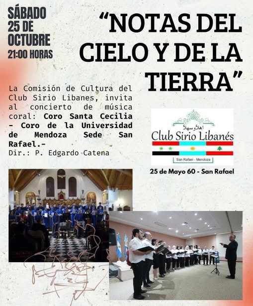 El sábado próximo, la Comisión de Cultura del Club Sirio-Libanés, llevará adelante un concierto de música coral, del que participarán el coro Santa Cecilia, como así también el de la sede San Rafael de la UM, que denominaron «Notas del Cielo y la Tierra».