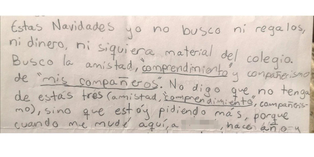 “Estas navidades yo no busco regalos ni dinero, ni siquiera material del colegio. Busco la amistad, ‘comprendimiento’ y compañerismo de ‘mis compañeros’”, escribió el nene de España.