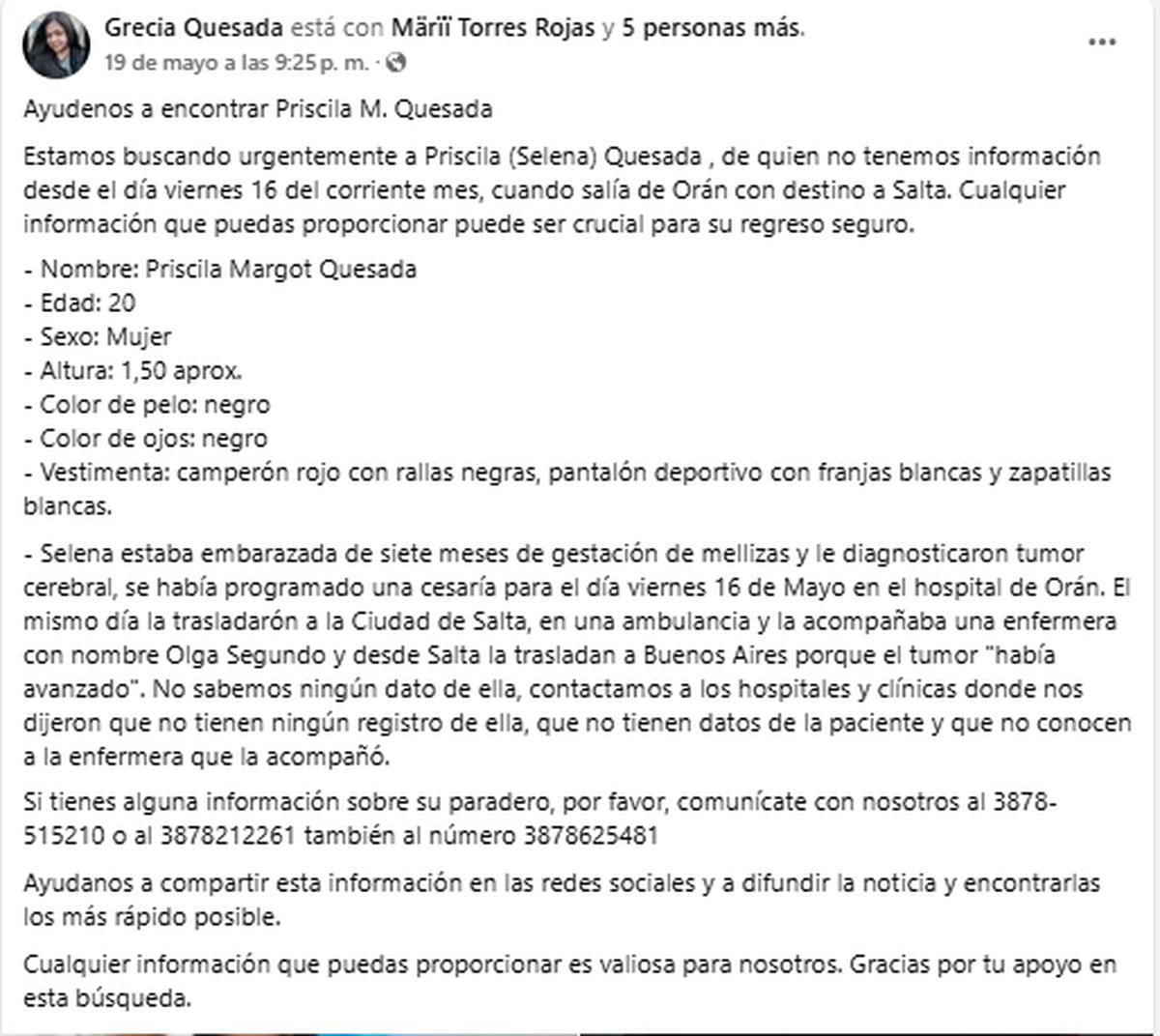 La provincia de Salta está conmocionada por la desaparición de Priscila Margot Quesada, una joven de 20 años que cursaba el séptimo mes de embarazo de mellizas y debía ser trasladada a Buenos Aires para ser operada por un tumor cerebral. Fue vista por última vez el viernes 16 de mayo, cuando se dirigía hacia el hospital local de Orán, vestida con una campera roja con rayas negras, pantalón deportivo y zapatillas blancas.