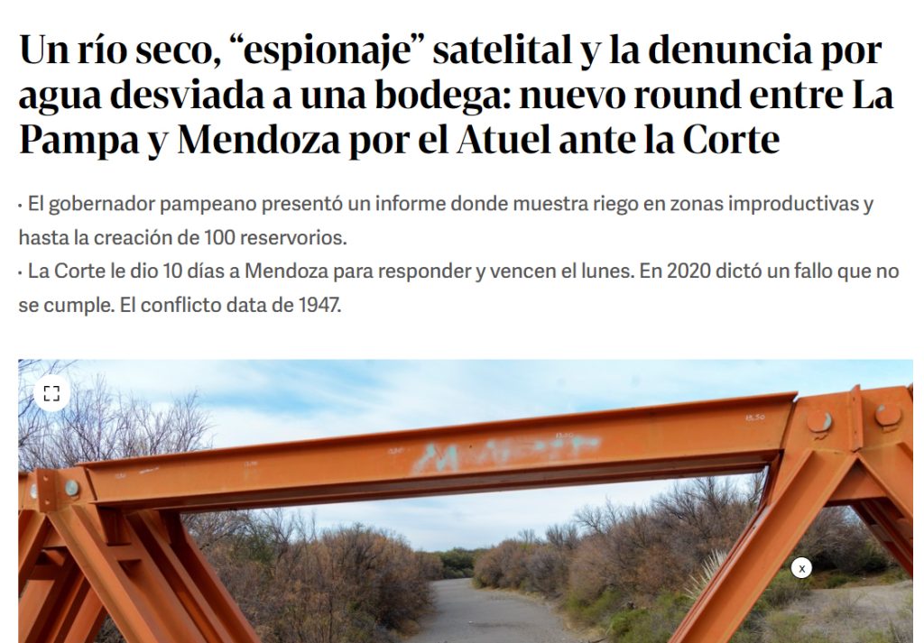 “Se están regando en tierras improductivas», señaló Sergio Ziliotto, gobernador de La Pampa a Clarín y agregó que “están regando una bodega, en épocas donde no se justifica desde el punto de vista fenológico, le están asignando lo mismo que la Corte fijo para el ingreso de la provincia de La Pampa”.