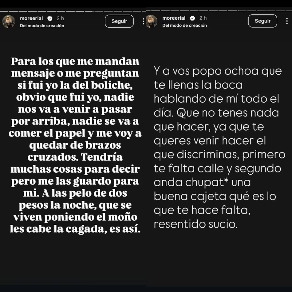 Por su parte, la influencer hizo fuertes posteos en sus historias de Instagram donde no desmintió lo ocurrido, además de que cuestionó a Pepe Ochoa por contar el incidente.