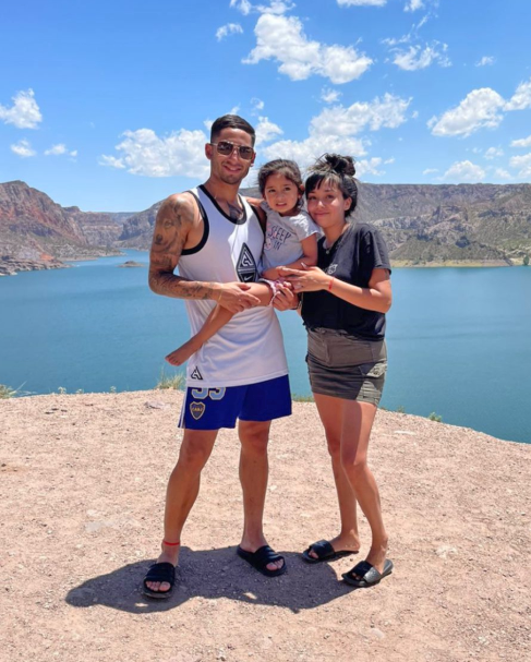 En esta ocasión quien apareció posando en San Rafael fue el joven y talentoso volante de Boca Juniors, Alan Varela, quien se sacó una foto en el Cañón del Atuel junto a su mujer y su pequeña hijita Aitana, y la compartió a través de su cuenta de Instagram.