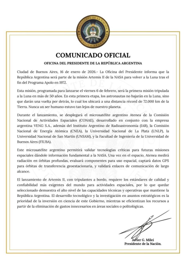 El Gobierno anunció este viernes que la República Argentina será parte de la misión Artemis II de la NASA para volver a la Luna tras el fin del Programa Apolo en 1972.
