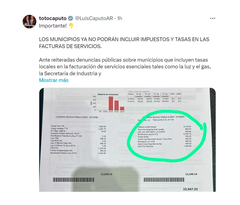 En una imagen de una factura de energía eléctrica del Municipio de La Costa que adjuntó a su mensaje en X, Caputo puntualizó -a manera ilustrativa- cuáles son los recargos impositivos muincipales que ya no podrán ser incluidos en el costo del servicio, entre ellos, tasas de seguridad e higiene, cuota social, Bomberos, una asociación cooperadora para un hospital y otras ordenanzas. Santiago Migone, funcionario de la Secretaría de Industria y Comercio, aseguró que “la resolución abarcará, además, a los impuestos provinciales no relacionados con el servicio”.