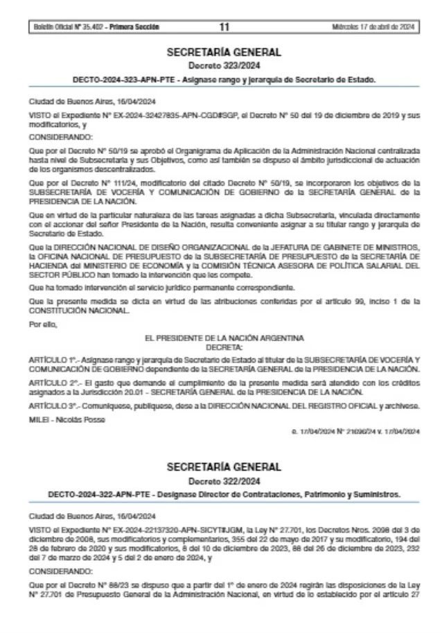 El vocero presidencial, Manuel Adorni, pasará a ocupar el cargo de secretario de Estado a partir de este miércoles, según el artículo 1 de la resolución 323/24 publicada hoy en el Boletín Oficial.