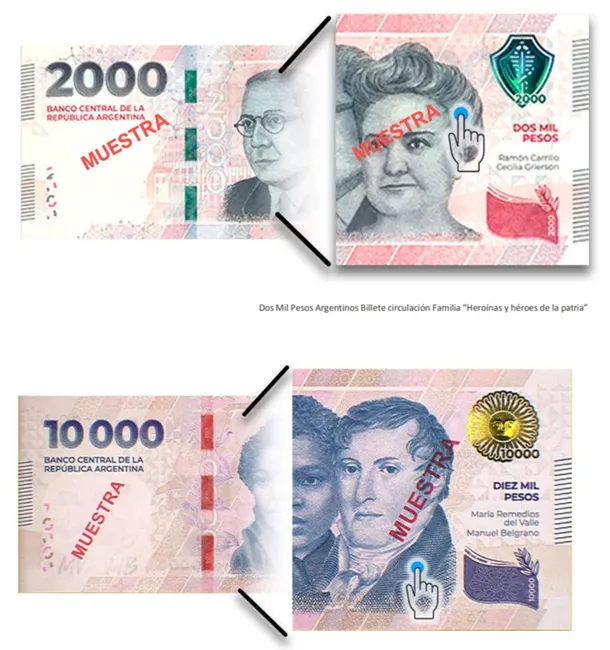 • Verifique la impresión calcográfica en el retrato, animal o símbolo principal. Debe sentirse en relieve al pasar los dedos.