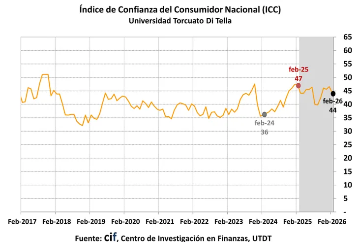 La confianza de los consumidores volvió a mostrar señales de deterioro en febrero, en un contexto marcado por el ajuste económico y la incertidumbre sobre la recuperación del ingreso. Según el último informe de la Universidad Torcuato Di Tella, el Índice de Confianza del Consumidor (ICC) se ubicó en 44,38 puntos, lo que representa una caída mensual del 4,7% y un descenso interanual del 6,09%.