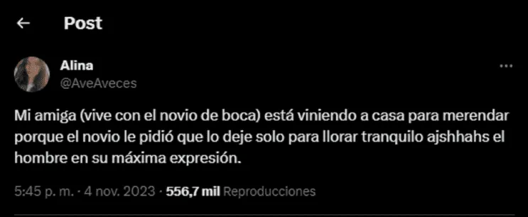 Con este panorama, la usuaria de “X” contó lo que le pasó a una amiga suya luego del partido final entre Boca y Fluminense. “Mi amiga (vive con el novio de Boca) está viniendo a casa para merendar”, comenzó diciendo la autora del posteo. La razón fue de lo más insólita, ya que “el novio le pidió que lo deje solo para llorar tranquilo”, luego de la derrota de Boca, que buscaba la séptima Copa Libertadores para sumar a su club.