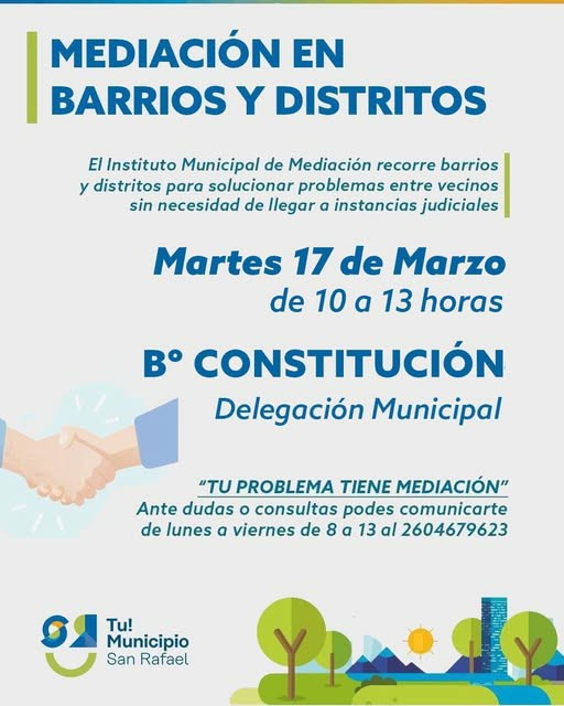 El martes visitarán la delegación del barrio Constitución. Los interesados pueden acercarse a solicitar turnos de mediación o a recibir orientación para casos que superen la competencia del área municipal.