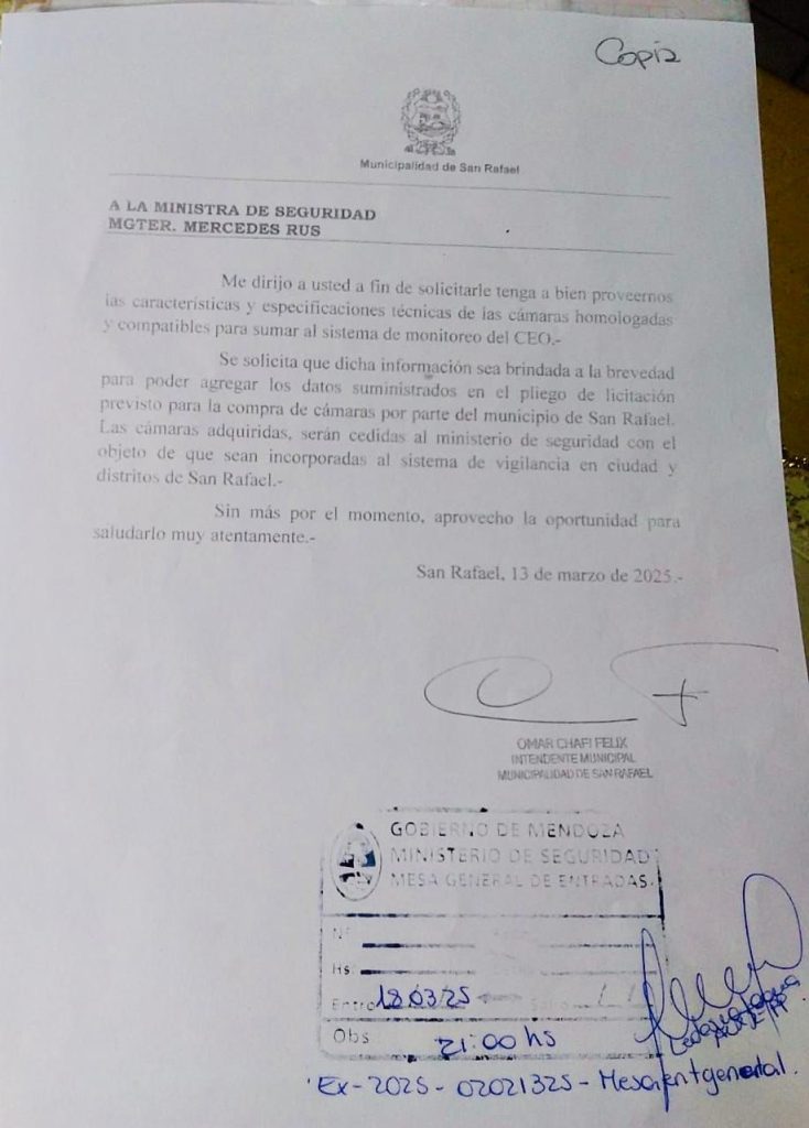 Los datos solicitados por Félix resultan clave para la siguiente instancia que quiere ejecutar el Municipio: adquirir nuevas cámaras de seguridad y ponerlas a disposición del Ministerio para ampliar el sistema de videovigilancia en San Rafael».