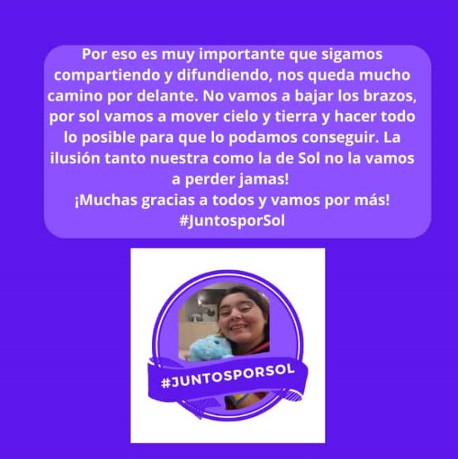 Sol Moreno tiene 20 años y padece tumor cerebral de nacimiento, por lo que su familia necesita reunir dinero para realizarle una cirugía que tendría lugar en Texas, Estados Unidos. Frente a esta situación sin diversas las actividades que se están llevando a cabo para concretar el viaje, y una de ellas se realizará el próximo lunes 21 de agosto en el Polideportivo Nº2 con un encuentro de artes marciales