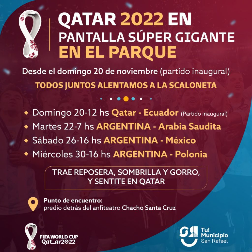 Se viene la Copa del Mundo de Qatar y sanrafaelinos y turistas podrán disfrutarla a pleno en el Parque de los Jóvenes, detrás del anfiteatro Chacho Santa Cruz, donde se colocará una súper pantalla de 9 metros de ancho por 5 de alto para vivir el encuentro inaugural y todos los partidos de la Selección Argentina.