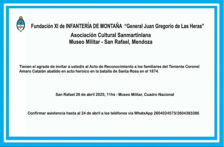 Este sábado 26 de abril, a las 11 de la mañana, el Museo Militar del Cuadro Nacional en San Rafael será escenario de un acto de homenaje al Teniente Coronel Amaro Catalán, quien perdió la vida en la batalla de Santa Rosa en 1874. La ceremonia es organizada por la Fundación 11° de Infantería de Montaña de Tupungato, la Asociación Cultural Sanmartiniana y el propio Museo Militar de San Rafael, con el objetivo de poner en valor un episodio clave del pasado mendocino y nacional.