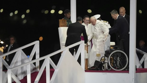 Una salva de cañones y una banda de música dieron la bienvenida al pontífice argentino, de 87 años, en la pista del aeropuerto de la capital, Puerto Moresby, tras un vuelo de seis horas desde Yakarta, Indonesia. Durante la breve ceremonia, Francisco perdió momentáneamente el equilibrio al pasar de su silla de ruedas a una normal, pero sus guardas de seguridad lo sostuvieron.