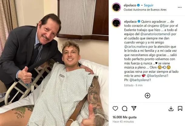 “Quiero agradecer de todo corazón al cirujano por el excelente trabajo que hizo, a todo el equipo del Sanatorio Otamendi por el cuidado que siempre me dan cuando vengo y a mi amigo Carlos Mattera por la atención que le brinda a mi familia y a mí cada vez que necesitamos algo. Gracias, salió todo perfecto y pronto volvemos con más fuerza que nunca. Se viene música a pleno, 0km”, escribió el cantante.