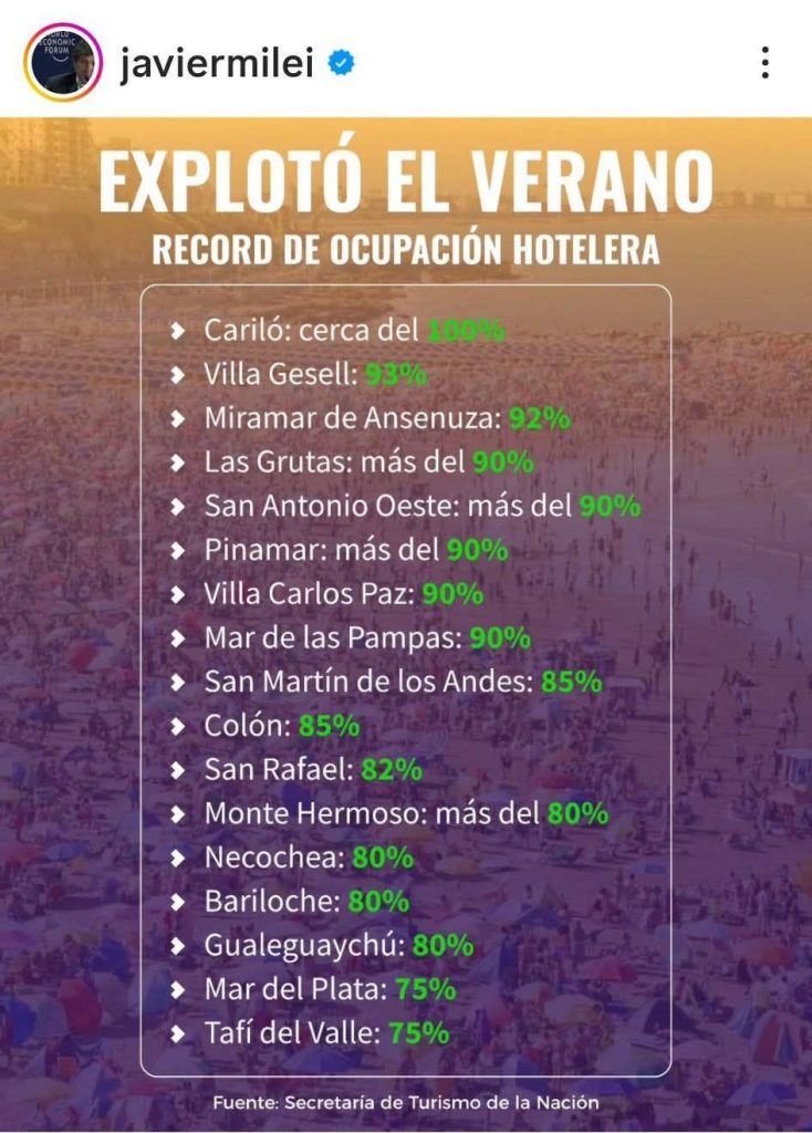 La publicación, titulada “Explotó el verano: récord de ocupación hotelera”, reúne datos atribuidos a la Secretaría de Turismo de la Nación, y enumera una serie de destinos con altos porcentajes de ocupación, entre ellos Cariló, Villa Gesell, Miramar de Ansenuza, Las Grutas, San Antonio Oeste, Pinamar, Villa Carlos Paz, Mar de las Pampas, San Martín de los Andes, Colón, Monte Hermoso, Necochea, Bariloche, Gualeguaychú, Mar del Plata y Tafí del Valle.