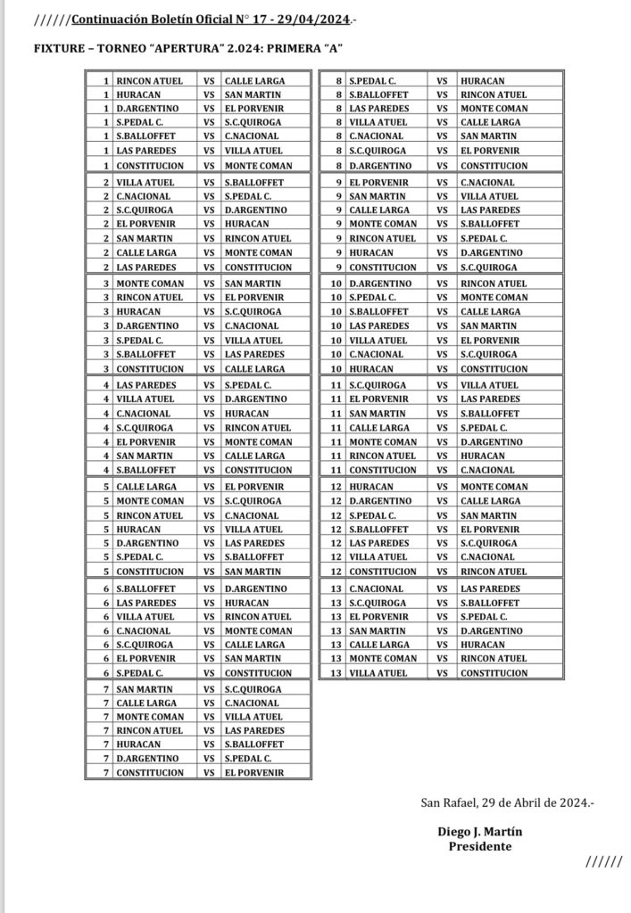 En cuanto a la 1ª fecha jugarán el 11 y 12 de mayo: Rincón del Atuel-Calle Larga, Huracán-San Martín, Deportivo Argentino-El Porvenir, Pedal-Quiroga, Balloffet-Cuadro Nacional, Las Paredes-Villa Atuel y Constitución-Monte Comán.