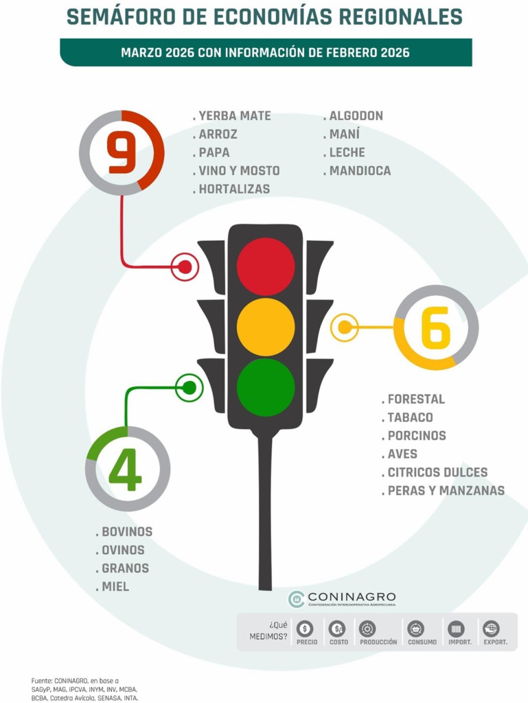 El informe de CONINAGRO releva 19 economías regionales basándose en tres pilares: el negocio (ingresos vs. costos), la producción y el área comercial (consumo y exportación). El resultado actual es preocupante. «En esta edición, nueve actividades están en rojo, el número más alto en lo que va del año. Yerba mate, arroz, papa, vino, hortalizas, algodón, maní, leche y mandioca se encuentran en esta situación de crisis. Otras seis, como cítricos dulces, peras, manzanas y porcinos, están en amarillo (alerta). Solo los bovinos, ovinos, granos y la miel se mantienen en verde», detalló Miazzo al inicio de la conversación.