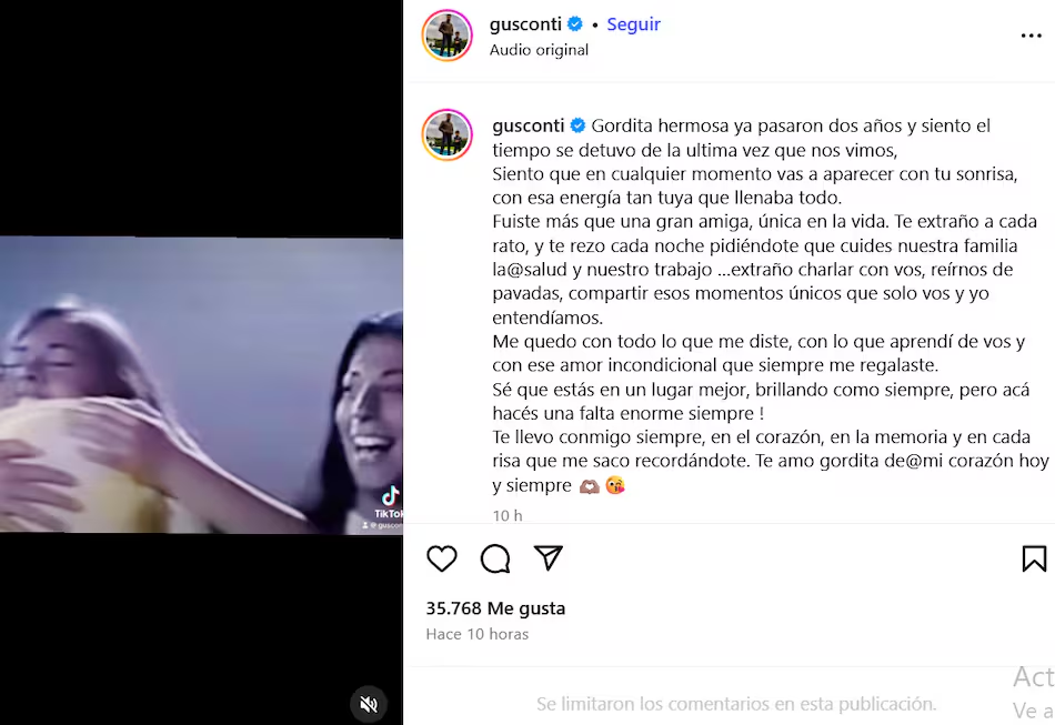 En ese sentido, Conti publicó un video y recordó a Silvina Luna. “Gordita hermosa ya pasaron dos años y siento que el tiempo se detuvo desde la última vez que nos vimos”, empezó escribiendo.