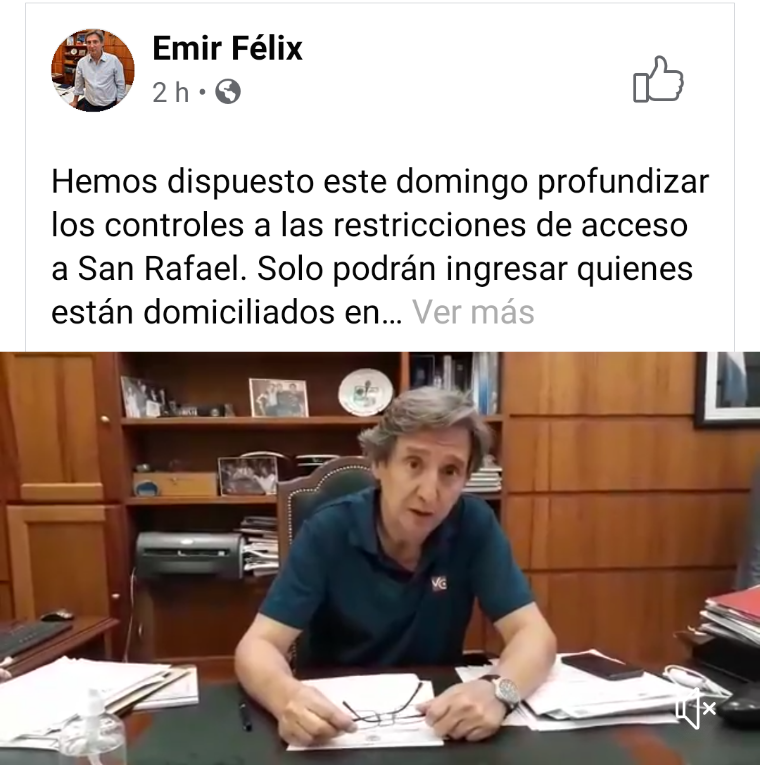 Félix, a través de un video publicado en redes sociales, indicó que solo podrán acceder a San Rafael quienes tengan domicilio en el departamento y se dediquen a actividades exceptuadas de la cuarentena.