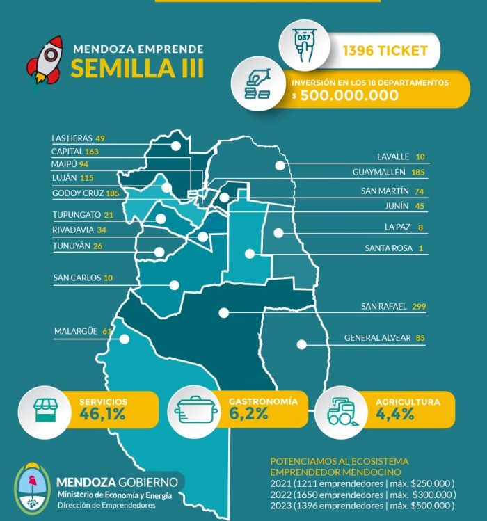 Tras el cierre del reciente llamado al programa de fomento al desarrollo emprendedor Mendoza Emprende Semilla 3, Economía elaboró un nuevo informe que detalla el nivel de participación de mendocinos y mendocinas de toda la provincia. Del total de presentaciones registradas (1.396) a través de las plataformas puestas a disposición desde el Ejecutivo provincial para la carga de los proyectos, 53,3% corresponden a mendocinos y mendocinas oriundas de los departamentos de San Rafael, Godoy Cruz, Guaymallén y Capital.