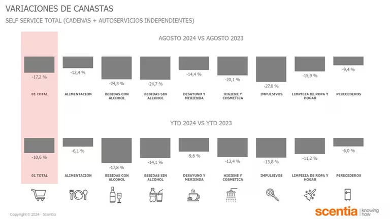 El consumo masivo cayó 17,2% interanual en agosto, siendo la mayor retracción desde marzo de 2021, mes en que la baja fue del 18,3%. En el acumulado de 2024, la disminución alcanza el 10,6%, según un informe de Scentia.