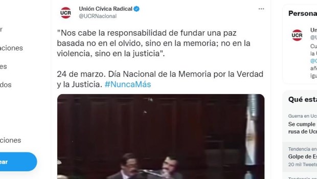 “Frente a la opción de la amnistía y el recuerdo de la violencia política, el gobierno de Alfonsín trajo paz, democracia, vigencia de los derechos humanos, el juicio a las juntas, el fin de la impunidad. Sentó las bases para el ciclo democrático más prolongado de nuestra historia”, se manifiesta en el texto difundido por la UCR.