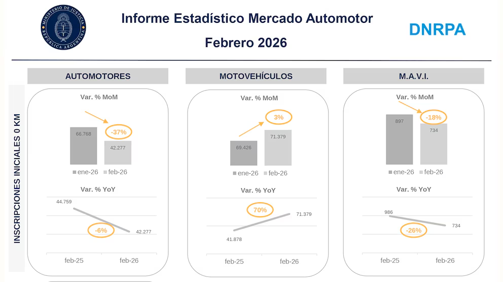 Sin embargo, todavía hay un misterio por develar. El sábado a la mañana, la Dirección Nacional de Registros de la Propiedad Automotor (DNRPA) publicó lo que por el momento es la única información oficial del mercado automotor de febrero, en un informe muy genérico y sin detalle alguno que solo aportó un dato único: se patentaron 42.277 vehículos en total, lo que representó una caída intermensual del 36,6% y una interanual del 5,5%.