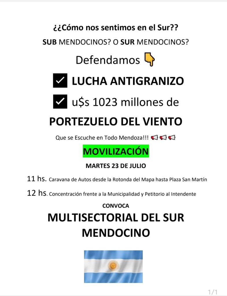 ¿Cómo nos sentimos SUB Mendocinos o SUR Mendocinos?, reza el comunicado de la Multisectorial. Allí no solo piden por la lucha antigranizo sino también por los 1023 millones de dólares de Portezuelo del Viento.