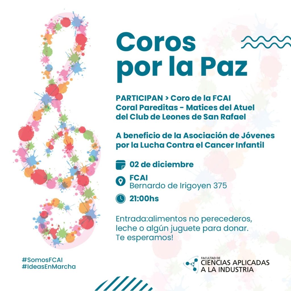 Este sábado 2 de diciembre a partir de las 21, se realizará un interesante encuentro musical. La cita es el Aula Magna de la Facultad de Ciencias Aplicadas a la Industria de la Universidad Nacional de Cuyo, sito en Bernardo de Irigoyen 375. Al respecto, Ricardo Miranda, a cargo de la difusión del evento, dijo a FM Vos (94.5) y Diario San Rafael que “estamos organizando un gran encuentro coral en la FCAI con un coro que viene de Pareditas (Coral Pareditas) que dirige Alejandro Scarpeta, quien fue el creador de Canta Pueblo. También participarán el Coro de la FCAI y Matices del Atuel del Club de Leones de San Rafael”, explicó. Comentó que “al evento lo hemos denominado “Coros por la Paz”, sobre todo porque sabemos que en la actualidad muchas partes del mundo se encuentran en guerra, y nosotros queríamos organizar algo que simbolizara la paz y que de alguna manera pudiera hacernos reflexionar. También como una forma de expresarnos en contra de todas las situaciones violentas que se viven en nuestro país”. Para concluir, Miranda invitó a toda la comunidad sanrafaelina y explicó el fin solidario que también persigue este encuentro musical. “Este evento tiene un fin benéfico que es recaudar a través de lo que se pide como entrada, alimentos no perecederos, leche o algún juguete para donar a los chicos integrantes de la Asociación de Jóvenes por la Lucha Contra el Cáncer Infantil, que en esta época del año confeccionan una caja navideña para las familias de los niños con cáncer que asisten”, dijo para concluir.