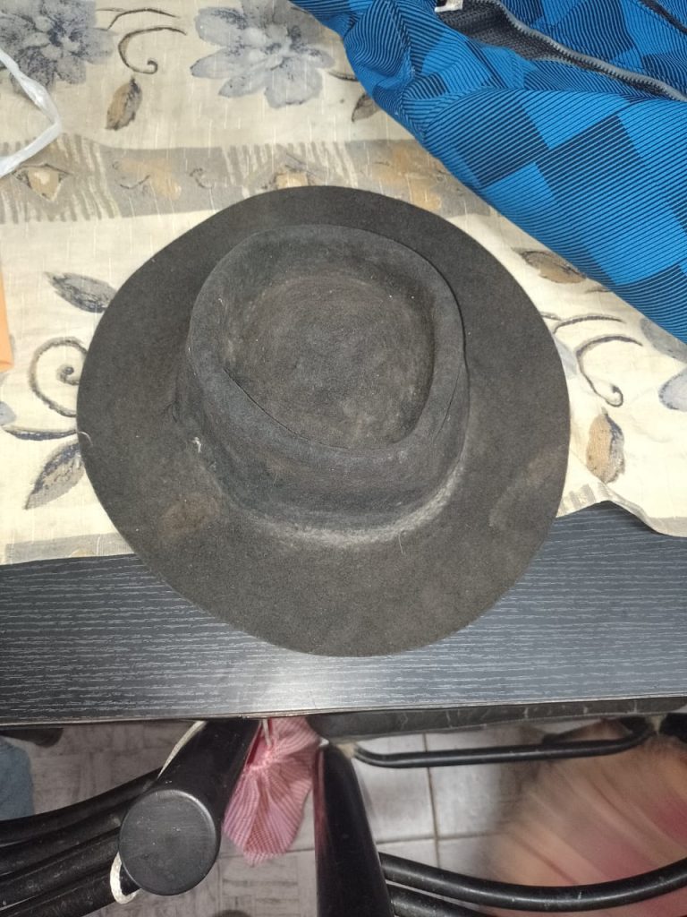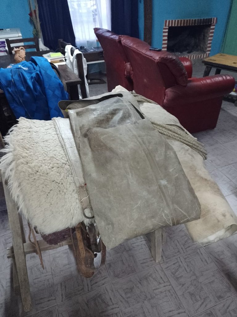 Un sombrero gauchesco de pana color negro, una campera celeste y una montura completa.