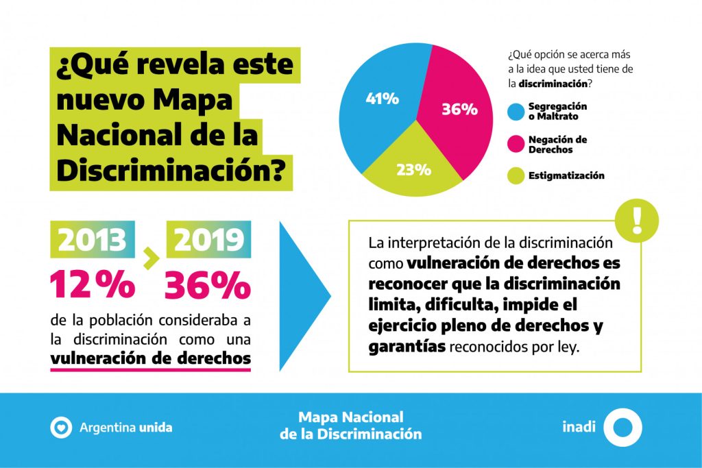 “Discriminación siempre habrá si no trabajamos en conjunto todos los organismos del Estado para erradicarlo, este mapa es un trabajo teórico que se hace para relevar datos como que en 2013 un 12% de la población entiende que la discriminación es una vulneración de derechos, en el mapa de 2019 ese número subió al 36%”, añadió.