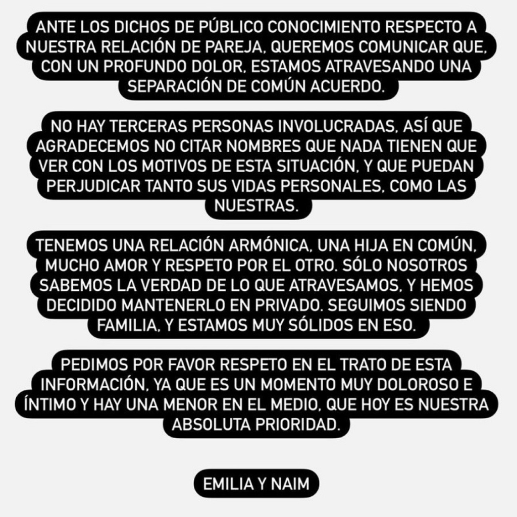 Y continúa dando a entender que no hubo infidelidad: «No hay terceras personas involucradas, así que agradecemos no citar nombres que nada tienen que ver con los motivos de esta situación y que pueden perjudicar tanto sus vidas personales como las nuestras».