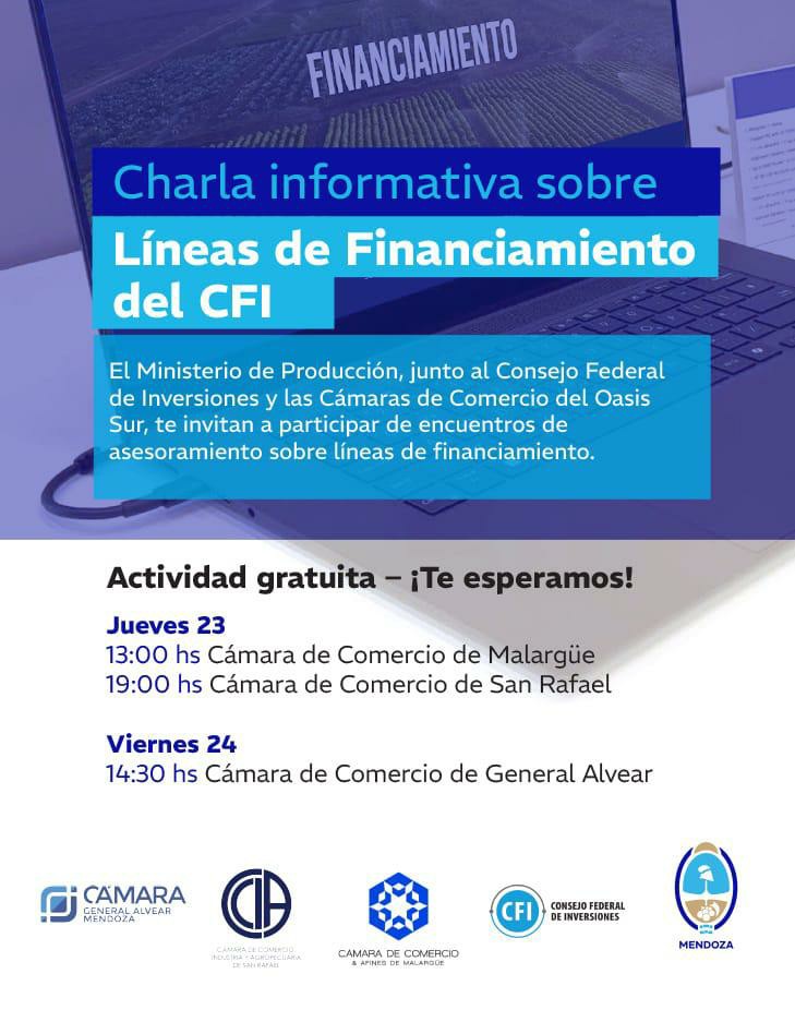 El Ministerio de Producción de Mendoza, en articulación con el Consejo Federal de Inversiones (CFI) y las Cámaras de Comercio del sur provincial, impulsará una serie de charlas informativas destinadas a dar a conocer distintas líneas de financiamiento orientadas a pymes y emprendedores. Las actividades se desarrollarán en Malargüe, San Rafael y General Alvear, con el objetivo de acercar herramientas concretas para el desarrollo productivo de la región.