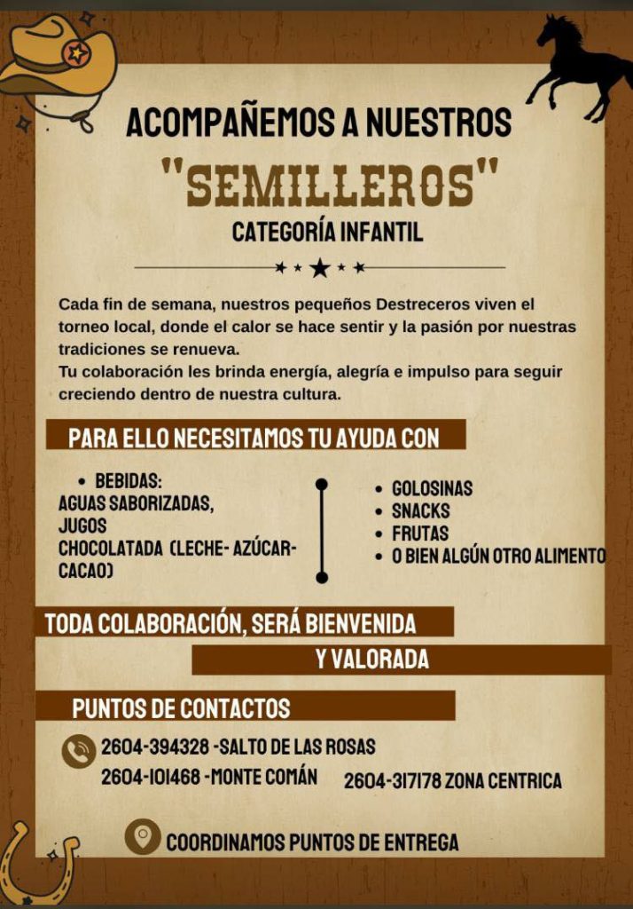 El domingo 23 de noviembre en el predio de la Federación Gaucha (ex zoológico municipal, dentro del parque Mariano Moreno). “Al respecto hemos largado lo que es el proyecto de semilleros, y estamos con lo que es la colaboración-niños, ya que tengamos en cuenta que para esto se realiza una actividad al aire libre pero también, la mayor parte del tiempo, están en el sol, por eso la idea es acompañarlos a ellos, brindarles una bebida para el calor, para que puedan recuperar energía y seguir”, expresó Jodar añadió que, para eso, se solicita agua, agua saborizada, jugo, leche chocolatada, snacks, frutas o golosinas.