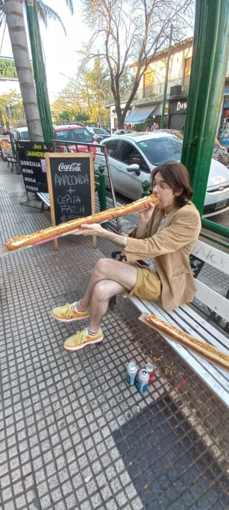 En la imagen se podía apreciar al chico sosteniendo el enorme pedido y dándole un buen mordisco. Atrás de él, un cartel del comercio detallaba una promo y su precio: «Anaconda (refiriéndose al pancho) + Cepita Fresh $1900». Así, en los comentarios el joven agregó que «el pancho solo estaba $1400, una verdadera ganga».