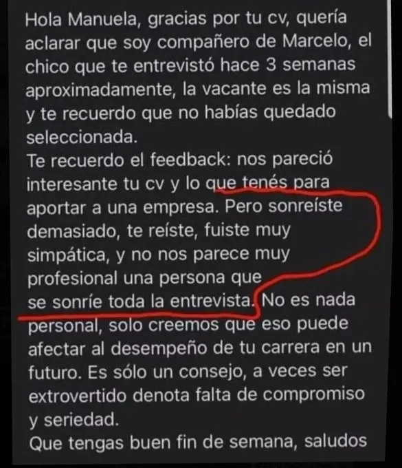 “No es nada personal, solo creemos que eso puede afectar al desempeño de tu carrera en un futuro. Es solo un consejo, a veces ser extrovertido denota falta de compromiso y seriedad. Que tengas un buen fin de semana, saludos”, cerró su devolución.