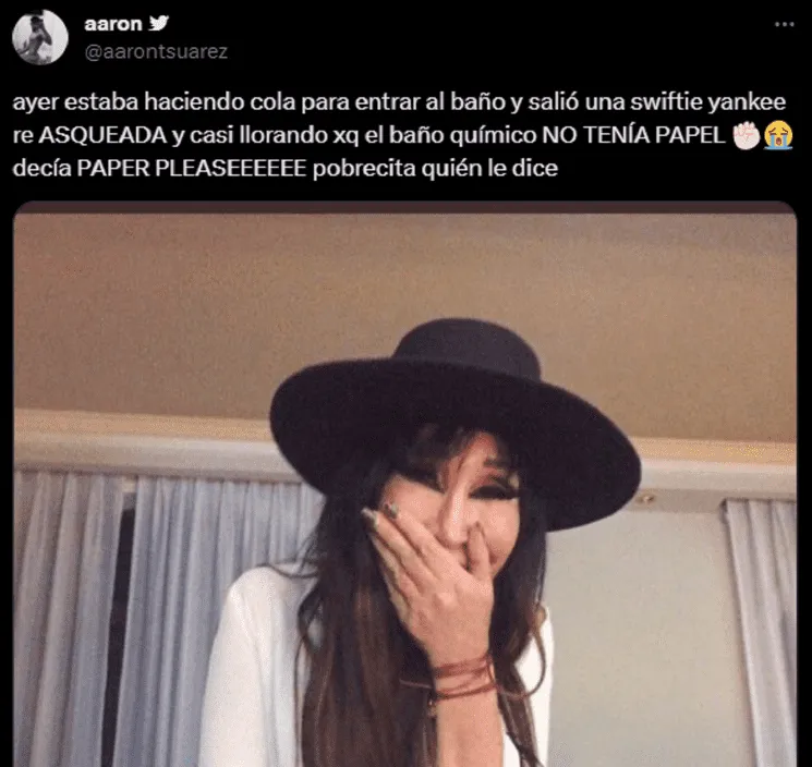 De acuerdo a lo que contó el usuario, él se encontraba haciendo la fila para ingresar al baño cuando vio salir a una «yanqui» de uno de los que se encontraban en el lugar. Estaba «asqueada y casi llorando porque el baño químico no tenía papel«, explicó.