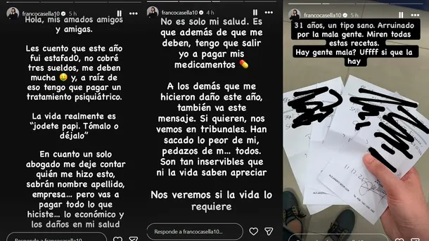 La catarata de publicaciones que lanzó Franco Casella -hijo de Beto Casella- en sus redes sociales terminó generando un revuelo inesperado. Con un tono descarnado, el joven describió el cuadro económico y personal que —según su propio relato— enfrenta desde hace meses, luego de atravesar una presunta estafa laboral que lo dejó sin el cobro de varios sueldos y lo empujó a iniciar un tratamiento psiquiátrico para sobrellevar el impacto emocional.