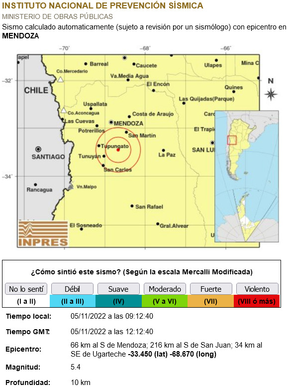 El epicentro se registró en la localidad de Ugarteche, en Luján de Cuyo, cerca del límite con Tupungato. Ahora, desde el Instituto Nacional de Prevención Sísmica evalúan si hubo o no consecuencias. Para ello se usa la escala mercalli y depende de cómo lo sintió la población y si hubo daños.