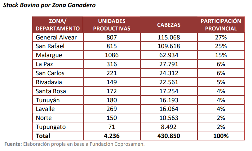 El stock bovino se concentra en la Zona Sur de la provincia, precisamente en los departamentos de San Rafael, General Alvear y Malargüe, representando el 67 % del ganado bovino.