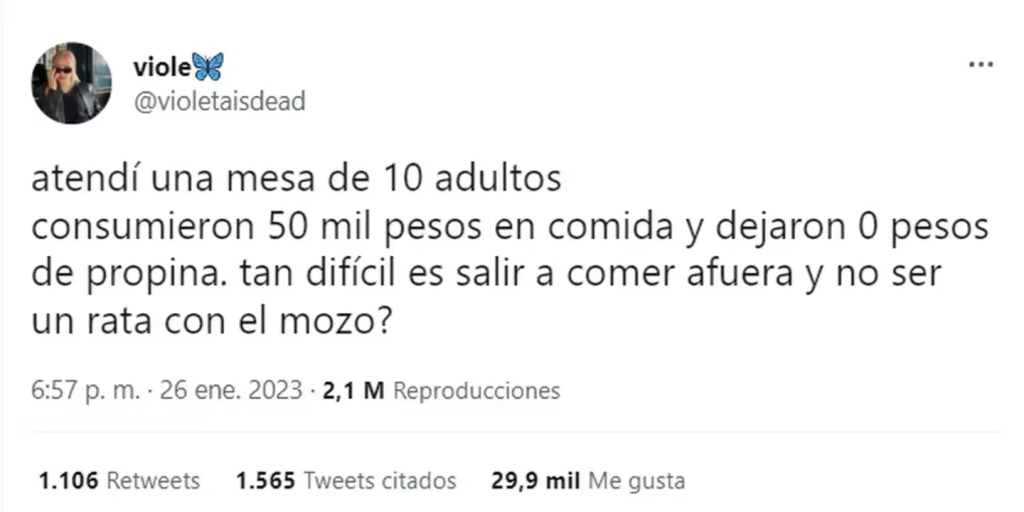 “Atendí una mesa de 10 adultos, consumieron 50 mil pesos en comida y dejaron 0 pesos de propina. ¿Tan difícil es salir a comer afuera y no ser un rata con el mozo? Propongo que lo hagan viral así les llega y les da tanta vergüenza y me pasan la propina por MP”, escribió Violeta a través de su cuenta de Twitter. A los pocos minutos, el tuit ya había alcanzado los 30 mil me gusta.