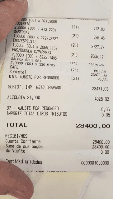 Como bien se puede ver en el ticket viral, el cliente gastó $28.400, y los dos platos de salmón le salieron más de 16 «lucas«. Y un dato que pocos dejaron pasar era el monto de IVA que llegó a los 4.928 pesos.