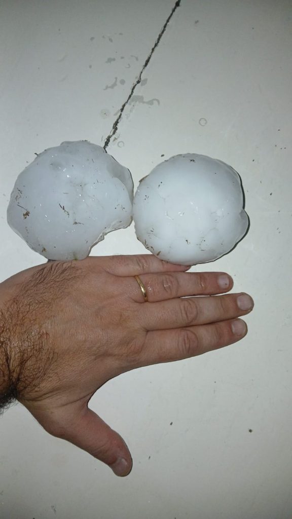 La tormenta anunciada por el Servicio Meteorológico Nacional se descargó con fuerza esta tarde en San Rafael, afectando diferentes sectores y con abundante granizo, en especial en Las Paredes, donde sorprendió el tamaño de la piedra.