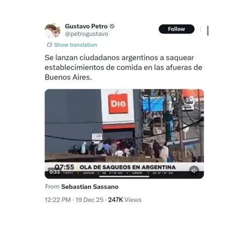 “Se lanzan ciudadanos argentinos a saquear establecimientos de comida en las afueras de Buenos Aires”, indicó Petro en su cuenta, la cual es seguida por más de 8 millones de usuarios.