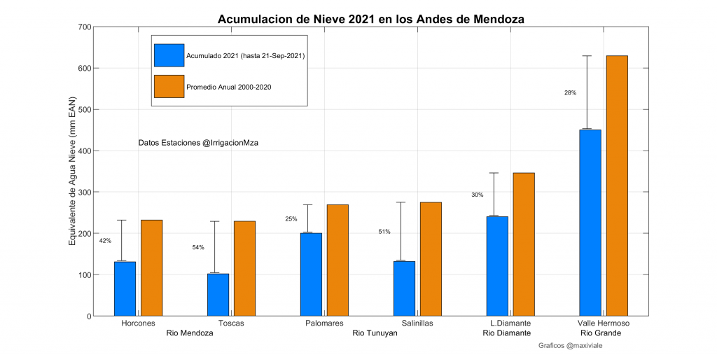 Entre algunos de los datos aportados se muestran que el acumulado hasta el 21 de septiembre de este año es un 28% menos que en las últimas dos décadas en la zona de Valle Hermoso en el río Grande, mientras que en la zona de Laguna del Diamante se registra un 30% menos que en el promedio de 2000 a 2020.