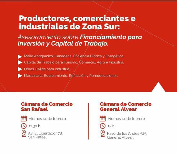 Por otro lado, Torelli recordó que este mismo viernes también se realizará una jornada de asesoramiento en General Alvear. “A partir de las 17 horas vamos a estar en la Cámara de Comercio de Alvear para atender a todas las personas interesadas en conocer nuestras líneas de financiamiento”, indicó.