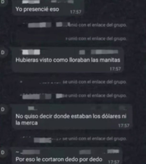 «No quiso decir dónde estaban los dólares ni la merca, por eso le cortaron dedo por dedo«, agregó la misma fuente, como se puede ver en las capturas, que pueden o no haber sido filtradas para profundizar el impacto aleccionador del triple femicidio.