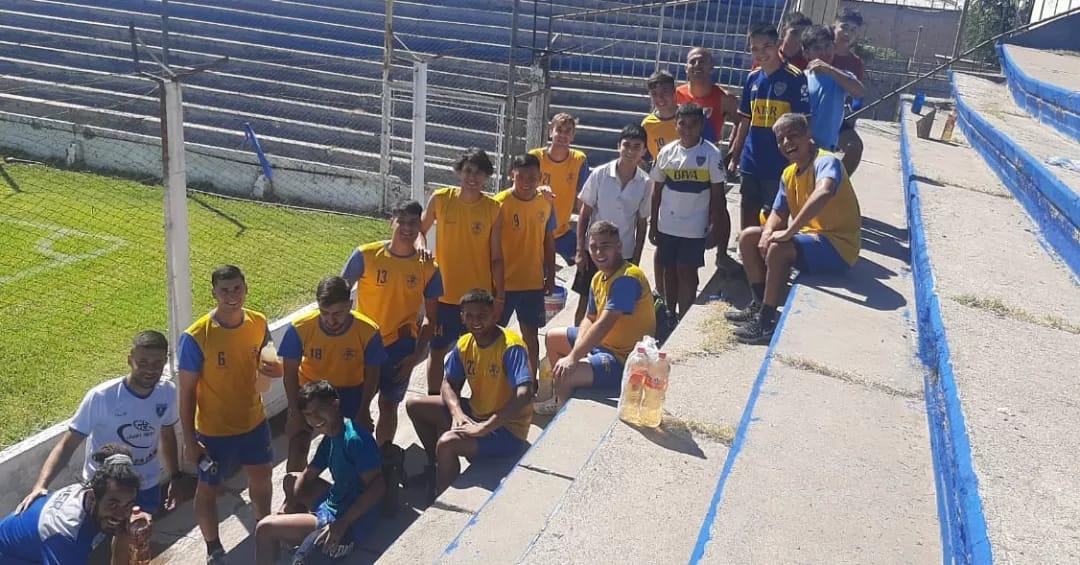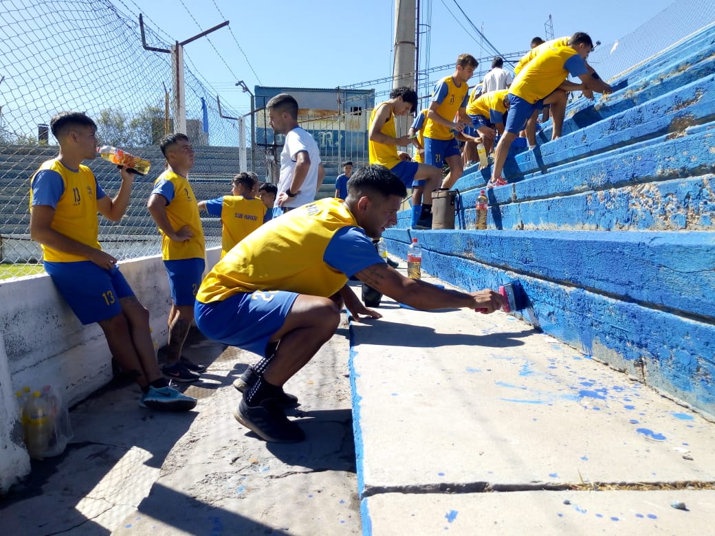 La Primera División, que se encontraba entrenando, una vez finalizada la práctica se sumaron y ayudaron con la pintura de las tribunas.