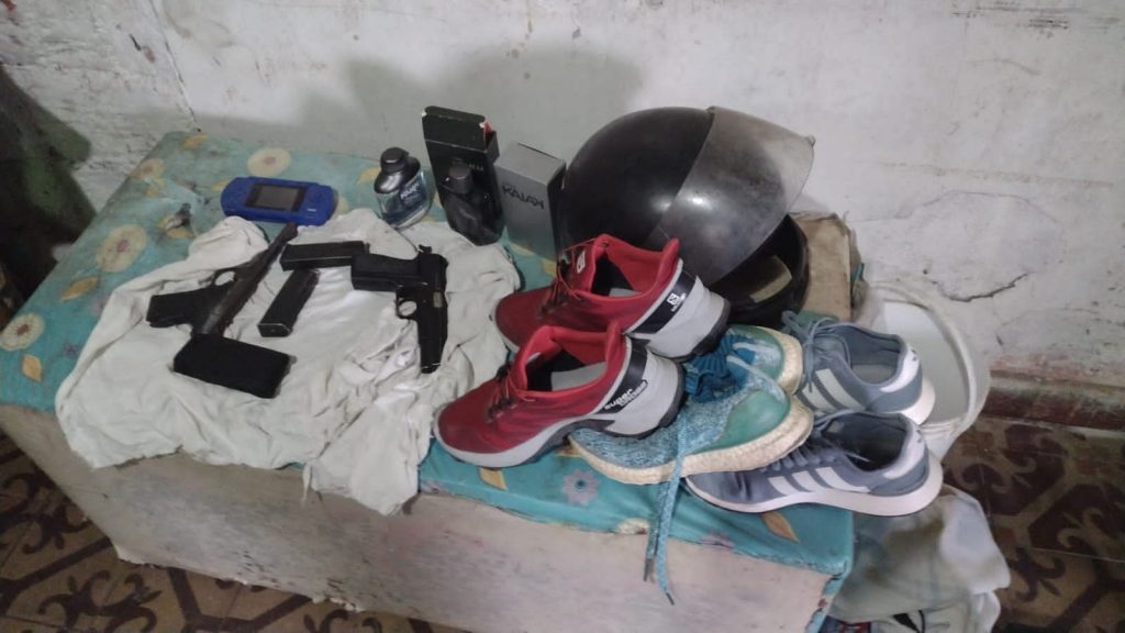 Se procedió el secuestro de “LA PISTOLA CALIBRE 9 mm., propiedad de la efectivo víctima, TRES PARES DE ZAPATILLAS, DOS PERFUMES, otra PISTOLA CALIBRE 22° MARCA TALA CON UN PROYECTIL EN RECAMARA, UN CASCO y 16,5 GRAMOS DE MARIHUANA”, debiendo ser trasladado a sede judicial. Actuaciones a cargo de la Oficina Fiscal de San Rafael.